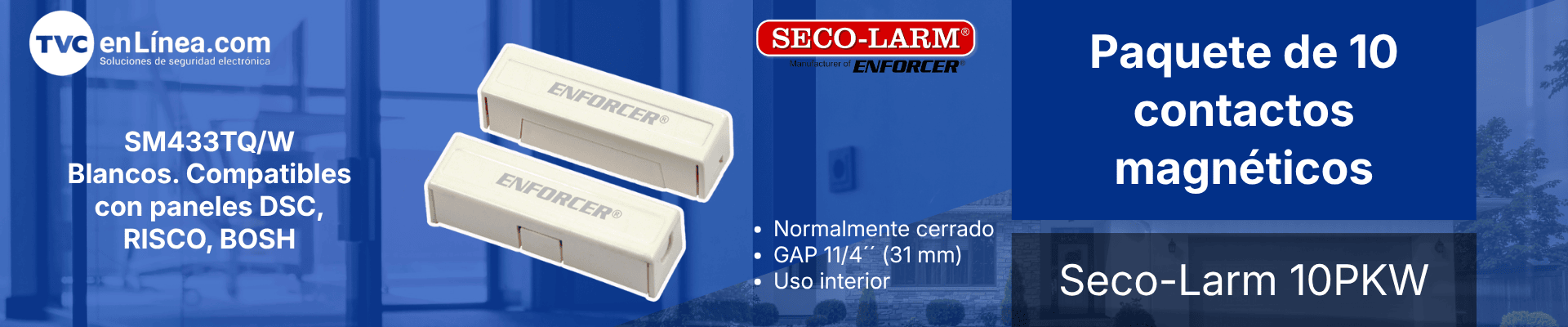 Paquete de 10 contactos magnéticos Seco-Larm SM-433-TQ/W de montaje superficial, diseñados para la protección de puertas y ventanas en sistemas de alarma. Operan en circuito cerrado (NC) con alta confiabilidad, incorporando terminales chapados en oro y contactos con recubrimiento de iridio para mayor durabilidad. Su diseño con cubierta oculta el cableado, ofreciendo una instalación limpia y profesional. Compatibles con paneles DSC, Risco y Bosch.